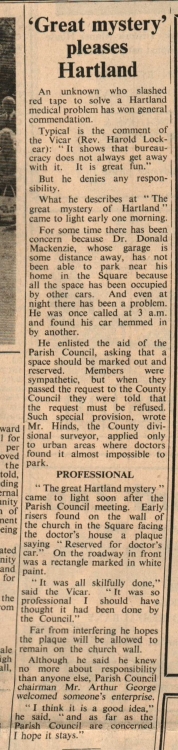 Dr Donald Mackenzie gets his reserved parking space and the Rev Harold Lockear describes it as ‘The great mystery of Hartland’.