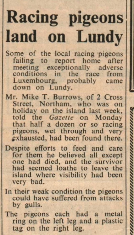 Mr Mike T Burrows, of 2 Cross Street, Northam told the Gazette that half a dozen or so racing pigeons, wet through and very exhauster, probably came down on Lundy.