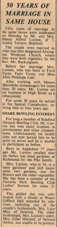 Mr and Mrs Sidney Alfred Luxton, 7 Ashley Terrace, Bideford, celebrate fifty years of marriage in the same house. Before her marriage, Mrs Luxton was Miss Alice Penelope Lott.