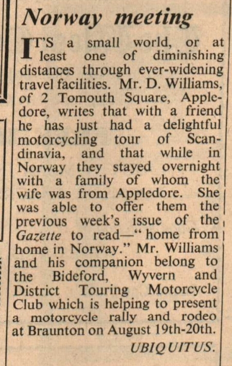 Mr D Williams of 2 Tomouth Square, Appledore, is ‘home from home in Norway’.