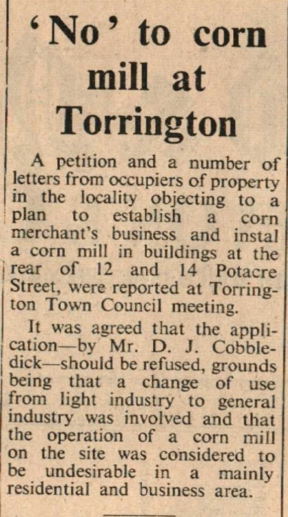 Mr D J Cobbledick is refused permission to establish a corn merchant’s business and corn mill in buildings at the rear of 12 and 14 Potacre Street, Torrington.