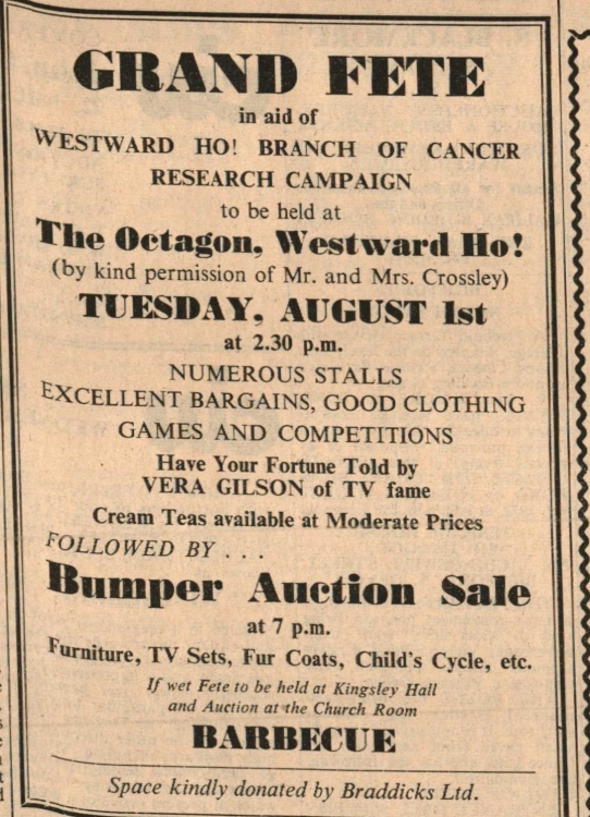 There’s a Grand Fete in aid of Westward Ho! Branch of Cancer Research Campaign at The Octagon, by kind permission of Mr and Mrs Crossley.