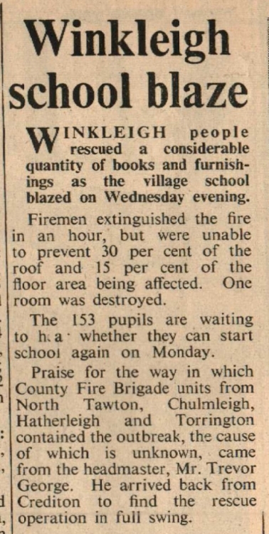Mr Trevor George, headmaster of Winkleigh village school praised the efforts of County Fire Brigade units.