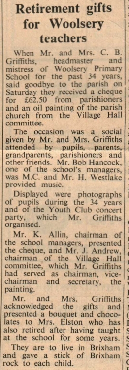 With some 65 years of teaching at Woolsery County Primary School between them, Mr and Mrs Cyril B Griffiths are retiring at the end of this term. Mr Griffiths has been headmaster there for 34 years, and his wife Marjorie has taught at the school for 31 years. A native of South Wales, he went to Leeds to qualify as a teacher and then ‘emigrated’ to Devon in 1930. He taught in Plympton, Kingsteignton, Paignton, Dartmouth and Bideford before being appointed headmaster at Woolsery in 1938. When war broke out he became a man of many parts in Woolsery, being billeting officer, salvage officer, air raid warden, a member of the Home Guard, and a member of the first aid post. He was organist at Bucks Mills Church and later at Woolsery Church for many years. Woolsery Youth Club, which he founded in 1944, soon became renowned for its concerts. It was in that same year that Mr Griffiths first joined Woolsery Parish Council, and he has been its chairman for the past 20 years. “If these wall could only speak” an illustrated history of Woolsery School, written by Mr Griffiths was published two years ago and attracted interest far beyond the parish. Mrs Marjorie Griffiths, a native of Sheffield, came to live in South Devon at an early age and attended Newton Abbot Grammar School. Qualifying as a teacher at the College of St Matthias, Bristol, she taught in Plympton, Newton Abbot and Barnstaple prior to her 31 years at Woolsery School. On coming to Woolsery she was instrumental in inaugurating the Women’s Institute there. During the war she was head of the Woolsery Section of the WVS and chief of the first aid post, and also assisted her husband with billeting duties. A staunch member of the parish church, Mrs Griffiths has long been a member of the Parochial Church Council. Mr and Mrs Griffiths have a married daughter, Lorna, who is also a teacher and lives in Saltash. Retirement gifts included a cheque for £62.50 and an oil painting.