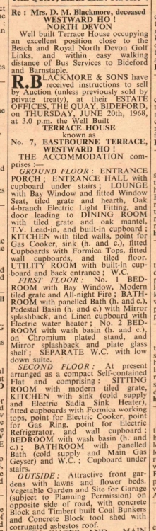 On behalf of Mrs D M Blackmore (deceased), no. 7 Eastbourne Terrace, Westward Ho! is for sale.