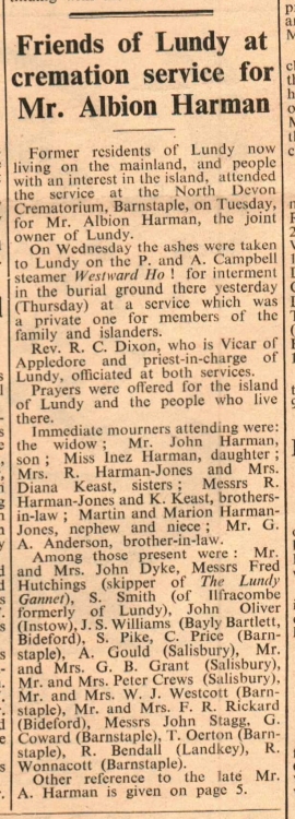 The cremation service of Mr Albion Harman, the joint owner of Lundy, was held at the North Devon Crematorium, Barnstaple. Rev R C Dixon officiated. The ashes were taken to Lundy on the P and A Campbell steamer Westward Ho! for interment.
