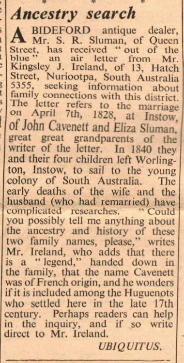 Mr Sluman receives a letter from Mr Kingsley J Ireland in South Australia researching family history for John Cavenett and Eliza Sluman.