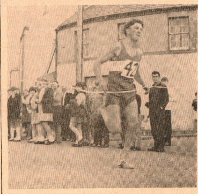 John Wood of Exmouth AC stretches into the tape to win the annual Quay Race at Appledore. Appledore’s Andy Cowlard, in the light strip, struggled neck and neck with Wood over the 265 yards but trailed by a tenth of a second. Third was John Robertson, of the Junior Leaders’ Regt.