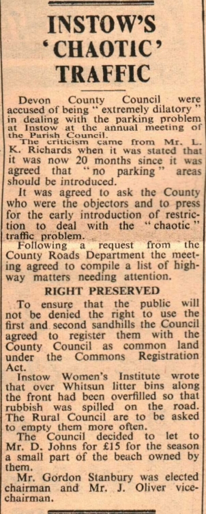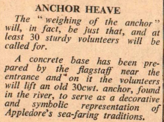 Mr Peter Mills, MP, will officially open Appledore Playing Field. The chairman and members of Northam Urban Council and representatives of Appledore Shipbuilders Ltd, and local organisations will be among those attending. The two acre playing field is on part of ‘The Holt’ estate and has a parkland setting with a fine view of the river. Present facilities include a small size football pitch, a full size netball pitch, a sand pit, and adventure playground equipment. Other facilities will be added in due course. Provision of the playing field has been sponsored by Northam Urban Council but Appledore is to take over responsibility for it and a trust fund has been formed. Total cost so far has been nearly £4,000, over a quarter of this is being met by the Anderson bequest. Tomorrow’s opening will be followed by an old English fair with stalls, Maypole and country dancing, and ‘weighing the anchor’ among the attractions.