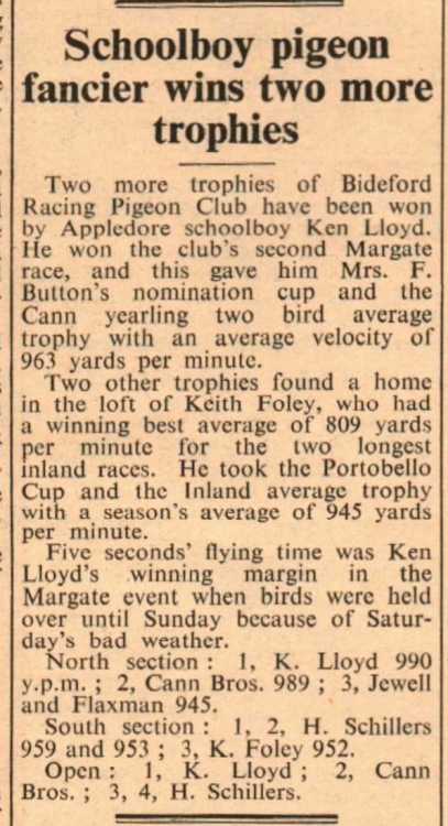 Two more trophies of Bideford Racing Pigeon Club have been won by Appledore schoolboy Ken Lloyd with two other trophies going to Keith Foley.