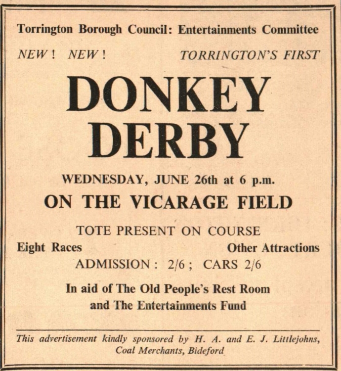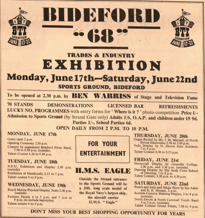 Bideford’s Trades & Industry Exhibition will take place 17-22 June in the Sports Ground. About 11,500 attended. A light-hearted moment at the Exhibition as 20 year old Miss Barbara Grenney, of Barton Tors, Bideford, wearing a nightdress from a women’s wear stand, ‘caps it’ with a man’s deerstalker hat with the assistance of Mr Roy Dyer, of Bideford.
