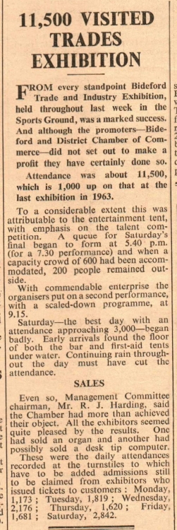 Pannier Market ‘does not justify expense on rates’ Mr Roger Chope told members of Bideford Chamber of Commerce. He said he was satisfied with the Town Council’s decision to charge £50 a day to people wishing to conduct dispersal sales there, but there was still the question of the Saturday and Tuesday lets. ‘I resent subsidising competitors’ he added. Answering the secretary, Mr Donald Moyse, he agreed that tolls had been increased, but only enough to cover expenses with a little over. Here was a public building in a prime position ‘eating its head off.’ It was a waste of a valuable piece of town property for the market no longer fulfilled its original purpose, which was merely to provide stalls for people who brought in fresh produce from the countryside. Mr R J Cleverdon pointed out that in many towns street markets provided 100 per cent more challenges to traders. And Mr Jeremy Ferguson warned that the Council could sell it to a multiple store. A retailing organisation ‘going full steam’ with people passing up and down the street six days a week would be preferable, said Mr Chope. Agriculture was a tremendous industry, said Mr Cleverdon, and if country people did not come her they would go elsewhere. There had been controversary about the cattle market, he recalled, and asked ‘Does Bideford want to push all this out?’