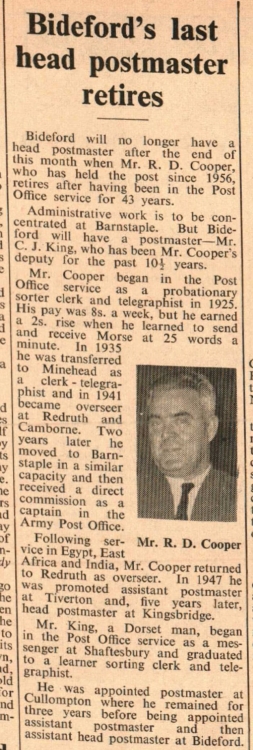 Mr R D Cooper is to retire as head postmaster in Bideford and the new postmaster will be his deputy, Mr C J King.