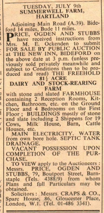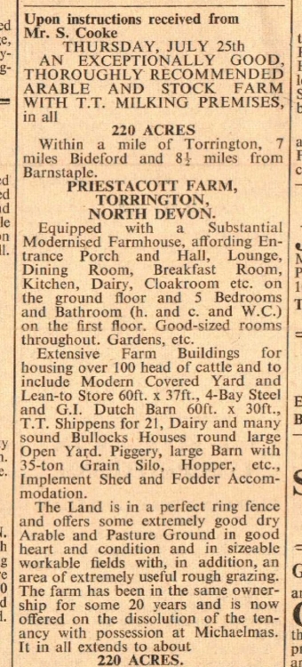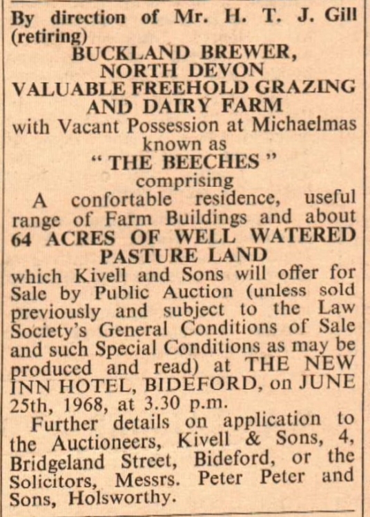 By direction of Mr H T J Gill, The Beeches, Buckland Brewer, is for sale. In a later article, the property was sold by private treaty at a higher figure than £10,500.