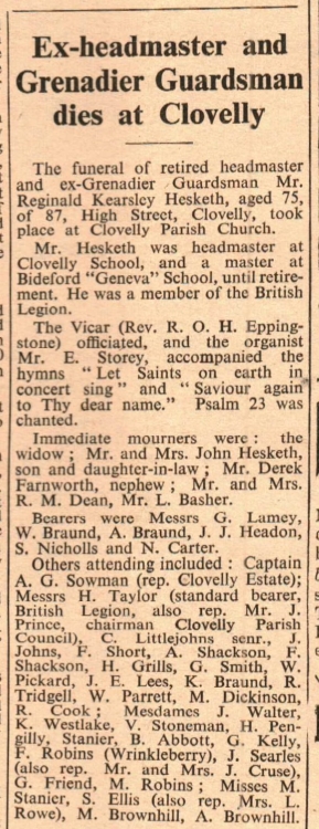 The funeral of retired headmaster and ex-Grenadier Guardsman Mr Reginald Kearsley Hesketh, aged 75, of 87 High Street, Clovelly, took place at Clovelly Parish Church.
