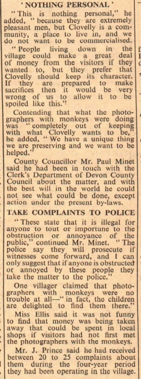 A copy of the by-laws on street trading in Clovelly is to be posted on the Parish Council’s notice board. The decision to publicise the by-laws in this way was taken at a public meeting called to sound local opinion about the presence of street photographers who use tame monkeys to attract custom. Three local members of the County Council – Sir Dennis Stucley, Mr Stanley Brimacombe and Mr Paul Minet – all told the parish councillors and members of the public attending that they could prosecute the photographers if they infringed either of two by-laws. The meeting was told that Clovelly could not reasonably expect any new by-laws to be passed to deal solely with street photographers. Mr C H England pointed out that the maximum penalty had now risen from £5 to £20. A large number of people were strongly opposed to street photographers, claimed the Rector of Clovelly, Rev R O H Eppingstone.