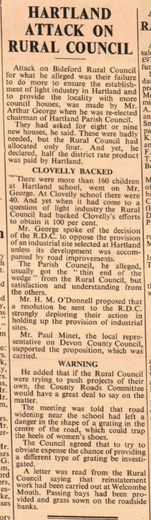 Mr Arthur George, chairman of Hartland Parish Council, attacked Bideford Rural Council for what he alleged was their failure to ensure the establishment of light industry in Hartland and to provide the locality with more council houses.