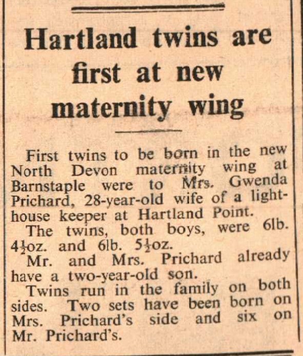 Mrs Gwenda Prichard, wife of a lighthouse keeper at Hartland Point, gives birth to twins.