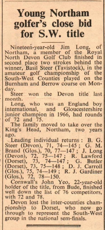 Nineteen year old Jim Long, of Northam, a member of the Royal North Devon Golf Club finished in second place two strokes behind the winner, in the amateur golf championship of the South-West Counties.