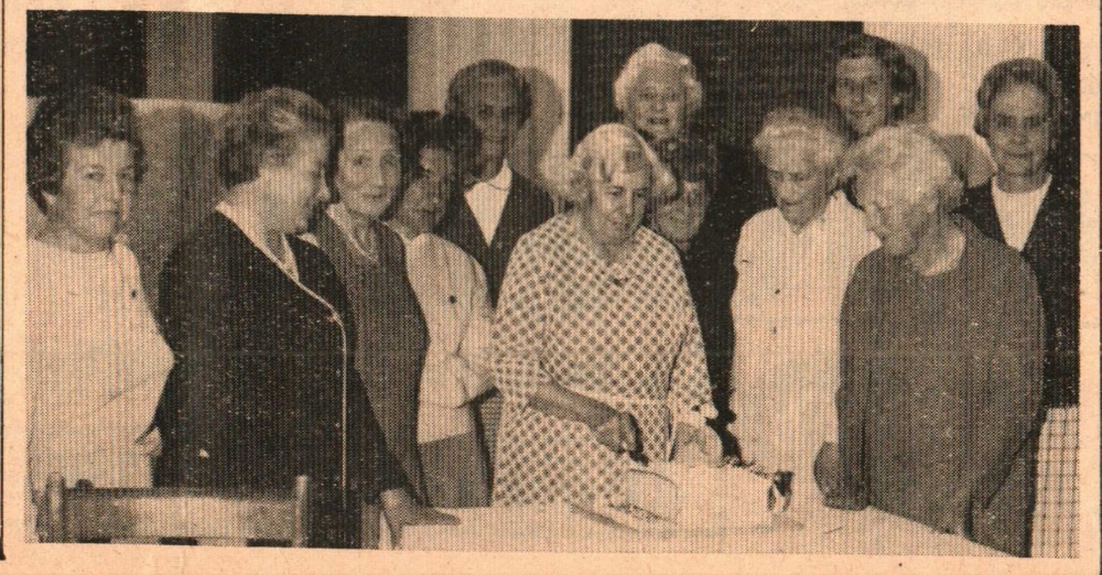 Cutting the cake on Friday evening as part of the celebrations by members of the Royal North Devon Golf Club ladies’ section and their guests of the 100th anniversary of the founding at Westward Ho! of a golf club for women. In the photograph are: Miss W M Fulford, Mrs H N Fulford, Miss B S Martin, Miss J Bruce, Mrs R Yewdall, Mrs S Creasy, Miss O Williams, Mrs J Mason, Mrs A A Smalley, Mrs M Sillem, Mrs P S Sparling, and Miss J Taylor. On Saturday prizes were presented by Miss Olwyn Williams, former president of the Ladies’ Golf Association and on Sunday by Mrs A A Smalley, president of the Royal North Devon ladies’ section. Owing to illness Mrs D McBeth, former England international, was unable to attend and present prizes.