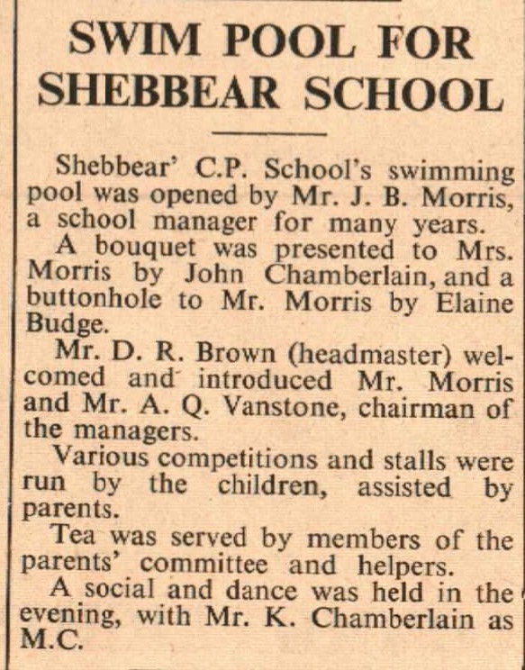 Shebbear’ CP School’s swimming pool was opened by Mr J B Morris.