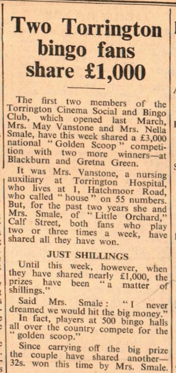 Mrs May Vanstone and Mrs Nella Smale share a prize at bingo at the Torrington Cinema Social and Bingo Club.