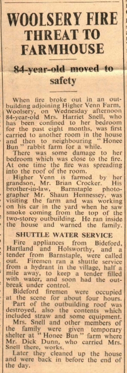 Mrs Harriett Snell, Higher Venn Farm, Woolsery, was moved to Honee Bun rabbit farm for safety when a fire broke out. Higher Venn is farmed by Mr Brian Crocker, and his brother-in-law saw smoke coming from an outbuilding. Mr Dick Dunn works at Honee Bun farm.