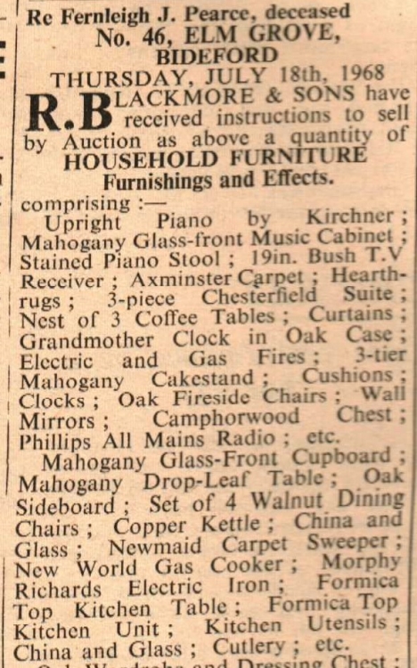 Household furniture from no. 46 Elm Grove, Bideford, is for sale.