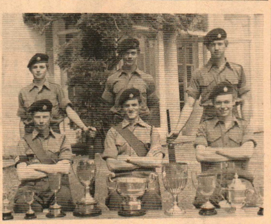 In the photograph are six of the finest young riflemen – R Webb, C Cross, D Stone, N Leakey, D Benallick, D Haslam - in the country. To prove it they display a table covered with trophies. They are the Army Cadet Force shotting team from Grenville College, Bideford, trained by Sergeant Gerry Beer.