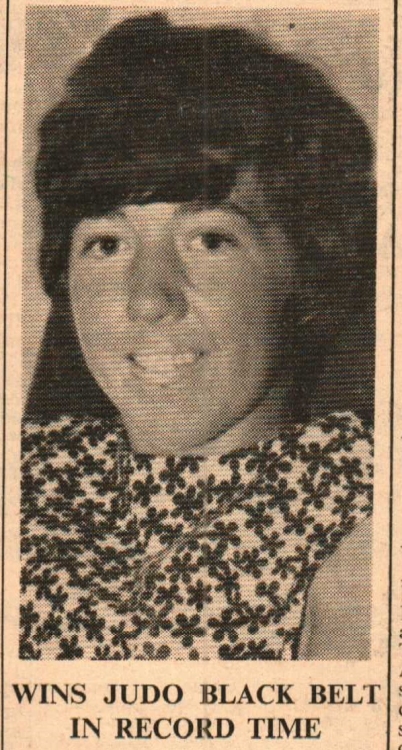 Twenty year old Sandra Moyse, of 8 Lower Meddon Street, has become the first Bideford girl to gain her judo black belt and she has done so in what is believed to record time! Sandra, daughter of Mr and Mrs A J Moyse, is employed at Lloyd’s Bank, Bideford. She joined the North Devon Judo Academy in Torridge Hill in August 1966 and last Sunday obtained her black belt (1st Dan) status. In charge of the grading was Masutaro Otani (black belt, 7th Dan), national coach to the British Judo Council. Mr Mervyn Francis, chief coach at the Academy, commented “Sandra is the first person I have ever known to have got her black in such short time. She owes it to her personal hard work, rather than to the club.” Sandra is the second girl member of the North Devon Judo Academy to gain her black belt, the other being Marie Beal, of Torrington.