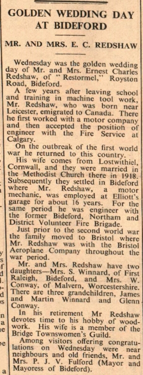 Mr and Mrs E C Redshaw, Restormel, Roystone Road, Bideford, celebrate their golden wedding day. They have two daughters – Mrs S Winnard, of First Raleigh, and Mrs W Conway, of Malvern. A Vartanian and G Beaumont were not available for the photograph.