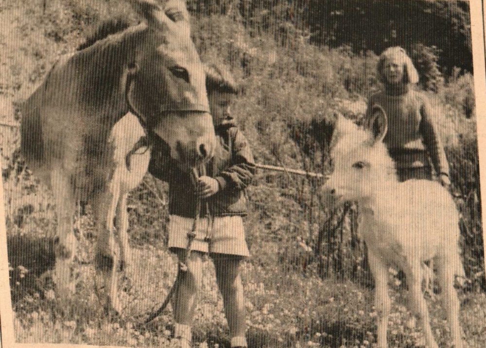 Welcome, little donkey. An almost all-white baby donkey is among the latest additions to Bideford Zoo and likely to prove a particular favourite with visitors. ‘Kandy Floss’ is the name given to this new arrival. Mother is ‘Sally’ and father ‘Piggy’ which is said to convey some indication of his temperament! Holding ‘Sally’ is Richard Cowland, of Appledore, while Mrs Katherine Tottenham, founder of the zoo, keeps a watchful eye behind ‘Kandy Floss’ who was running free.