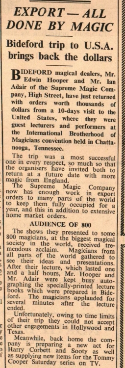 Bideford magical dealers, Mr Edwin Hooper and Mr Ian Adair of the Supreme Magic Company had a successful trip to the United States and return to start work with Harry Corbett and Sooty, as well as Tommy Cooper.
