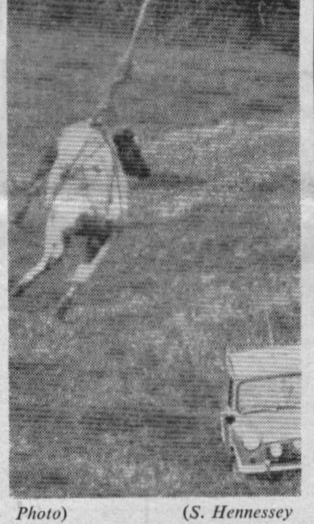 A Friesian heifer belonging to Mr Allan Bray, Bucks Barton, Bucks Cross, was rescured by a Whirlwind helicopter despatched from RAF Chivenor.