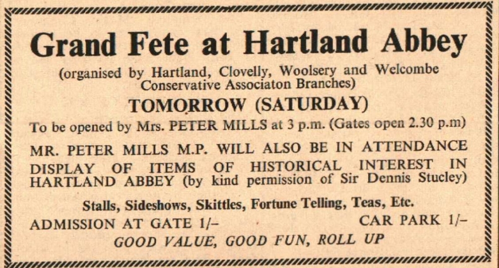 A Grand Fete will be held at Hartland Abbey and opened by Mr Peter Mills, MP.
