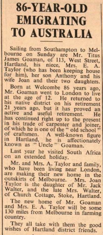 Mr Titus James Goaman, of 113 West Street, Hartland, his niece Mrs E A Taylor, her son Anthony and his wife Joan and two daughters, are emigrating to Australia. Mrs Taylor is the daughter of Mr Jack Walter, and the late Mrs Walter, of Church Cottage, Stoke.