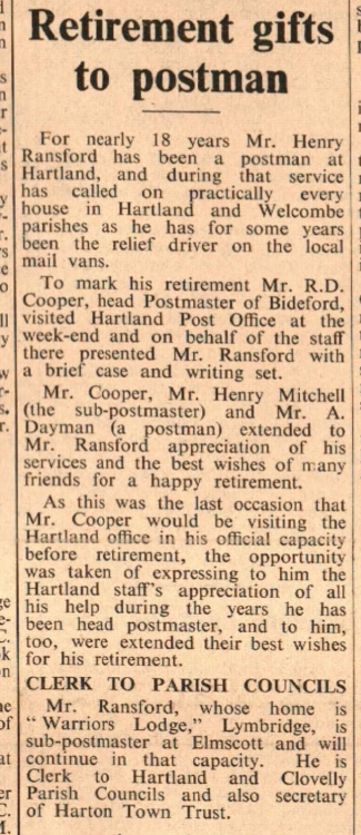 Mr Henry Ransford, of Warriors Lodge, Lymbridge, retires as a postman for Hartland and Welcombe parishes and is presented with a brief case and writing set by Mr R D Cooper, head Postmaster of Bideford.