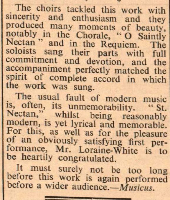 The first performance was given at St Nectan’s Church, Stoke, Hartland, of the cantata ‘St Nectan’, the words and music of which were composed by Mr G H Loraine-White, organist there. Taking part were the choir of St Nectan’s Church with a section of Shebbear College choir, Jaqueline Hopper, Kenneth Lewis, Derek Whittington, and Michael Richardson.