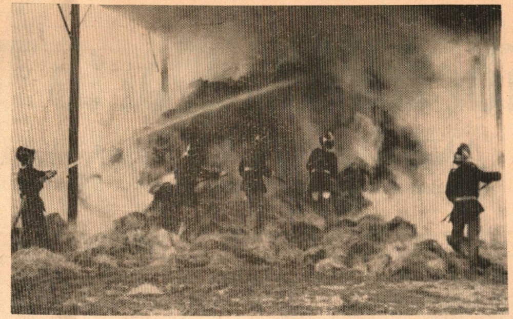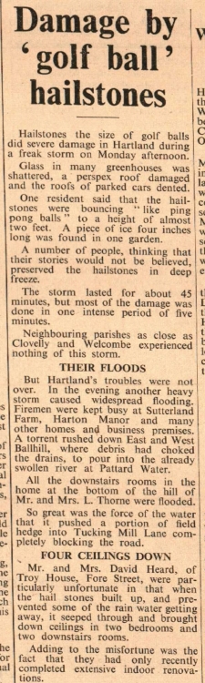 Firemen from Bideford and Torrington called to the farm of Mr and Mrs W H Chamings, Little Weare, Weare Giffard, shortly after 3am found about 80 tons of hay in a dutch barn well alight. They were unable to leave until 15 hours later, and almost all of the hay, representing much of this season’s crop, was burned or badly damaged. There was also damage to the barn, which, fortunately, is isolated in the farmyard. Two appliances had to pump water 1,500 feet, but the firemen received substantial help from Mr and Mrs Chamings’ employees who moved a good deal of the hay with mechanical aids.