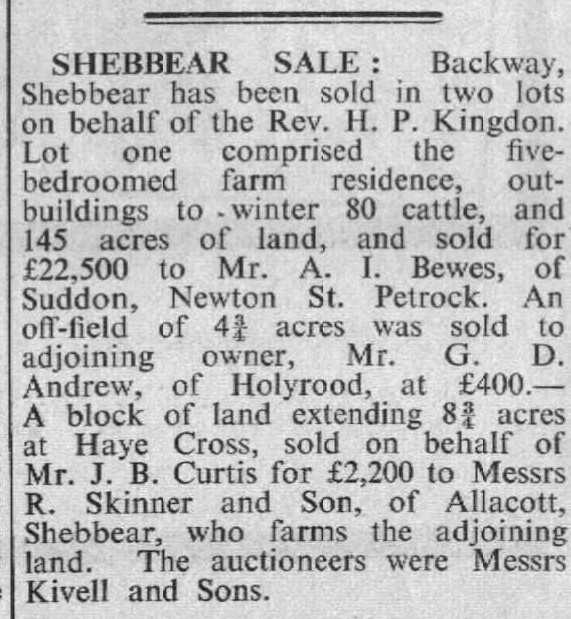 Backway, Shebbear, has been sold in lots on behalf of the Rev H P Kingdon to Mr A I Bewes , Mr G D Andrew, and Messrs R Skinner and Son, of Aliacott.
