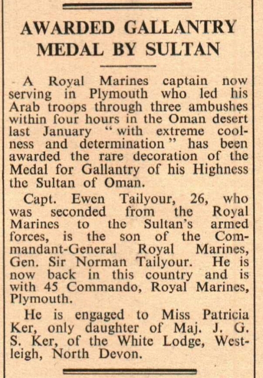 Capt Ewen Tailyour, who is engaged to Miss Patricia Ker, only daughter of Maj J G S Ker, of the White Lodge, Westleigh, has been awarded the Medal of Gallantry of his Highness the Sultan of Oman.