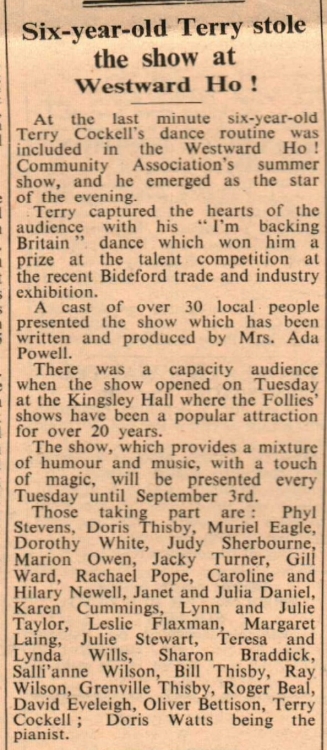 Terry Cockell’s dance routine steals the show at the Westward Ho! Community Association’s summer show. Those taking part: Phyl Stevens, Doris Thisby, Muriel Eagle, Dorothy White, Judy Sherbourne, Marion Owen, Jacky Turner, Gill Ward, Rachael Pope, Caroline and Hilary Newell, Janet and Julia Daniel, Karen Cummings, Lynn and Julie Taylor, Leslie Flaxman, Margaret Laing, Julie Stewart, Teresa and Lynda Wills, Sharon Braddick, Salli’anne Wilson, Bill Thisby, Ray Wilson, Grenville Thisby, Roger Beal, David Eveleigh, Oliver Bettison; Doris Watts being the pianist.