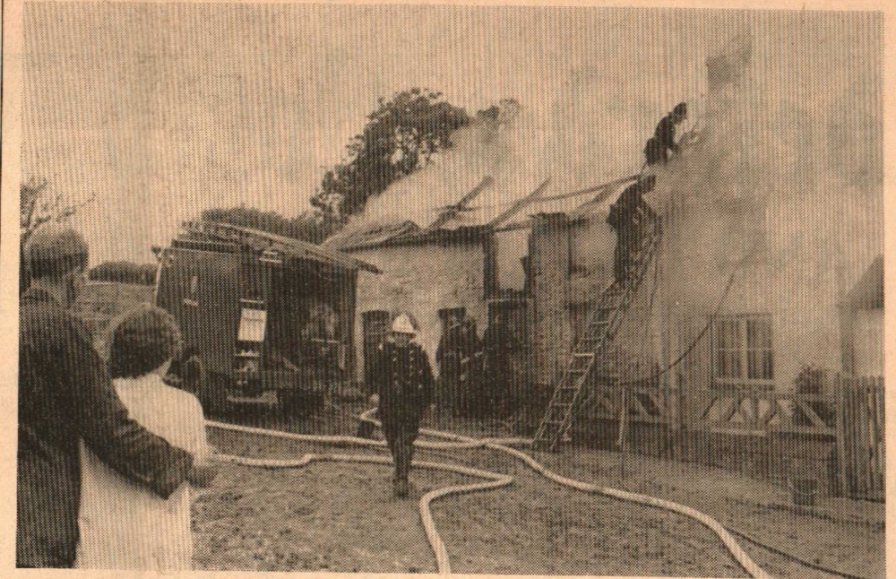 ‘Great work by the firemen!’ was the heartfelt comment by the owner of Higher Venn Farm, Woolsery, Mr Brian Crocker, after they managed to prevent an outbreak from damaging much of the actual farmhouse, which adjoined the barn and equipment store which was gutted. Just as the flames were beginning to get hold of the near bedroom’s roof the first fire appliance arrived, and soon the outbreak was under control. Firemen from Hartland, Bideford and Holsworthy were at the scene, plus a tender from Barnstaple. In the photograph Mr Brian Crocker supports his wife Bethe.