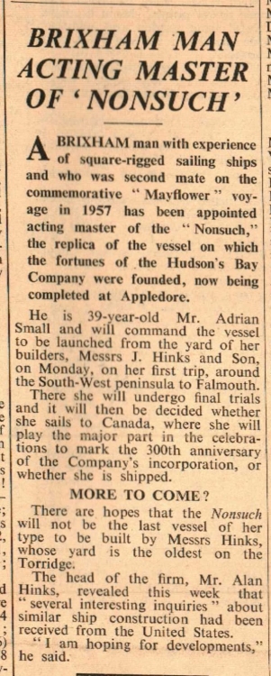 A Brixham man with experience of square-rigged sailing ships and who was second mate on the commemorative Mayflower voyage in 1957 has been appointed acting master of the Nonsuch, the replica of the vessel on which the fortunes of the Hudson’s Bay Company were founded, now being completed at the yard of Messrs J Hinks and Son. He is Mr Adrian Small.