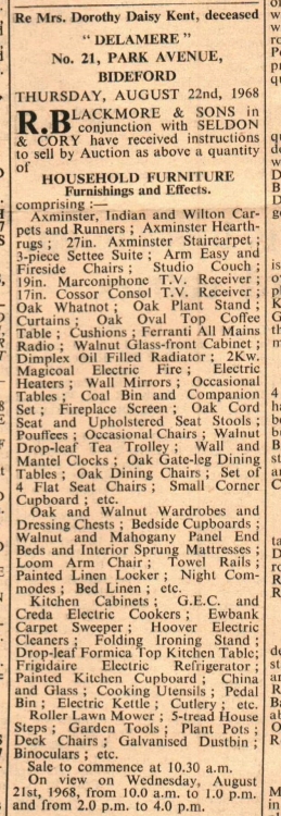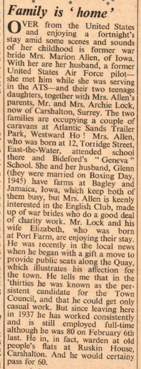 Mrs Marion Allen, of Iowa, with husband, two daughters, and her parents Mr and Mrs Archie Lock, is ‘home’ and staying at Atlantic Sands Trailer Park in Westward Ho! She was born at 12 Torridge Street, East-the-Water and attended Bideford’s Geneva School.