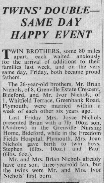 Twins’ double – same day happy event - Mr Brian Nichols, of 8 Grenville Estate Crescent, Bideford, and Mr Ivor Nichols, of 1Whitfield Terrace, Greenbank Road, Plymouth.