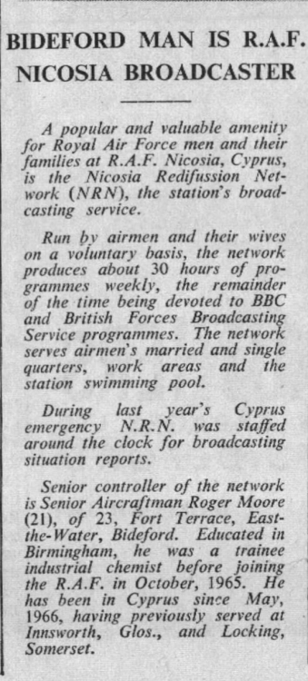 Bideford man – Senior Aircraftman Roger Moore, of 23 Fort Terrace, East-the-Water – is RAF Nicosia Broadcaster.