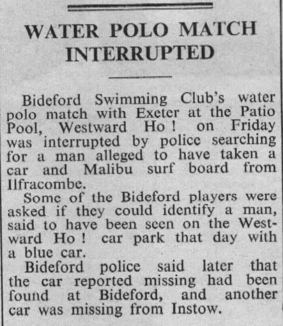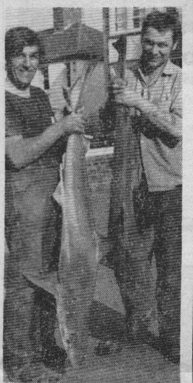 Late night bathers ‘land’ giant fish. Summer late night bathing has – temporarily at least – lost some of its charm with the Johns and Saintey families, of 108 Lime Grove, Bideford. Mr and Mrs Brian Johns and Mr and Mrs Martin Saintey set off for a swim near the slipway at Westward Ho! They were up to their knees in water when violent thrashings nearby caught their attention. Moving over for a closer look, they saw two shark-like fish that had been trapped by the outgoing tide. A combined effort by the two men was needed before the two fish were removed from the water and it was not done without quite a struggle. After a day in the family bath after being transported alive in the boot of a car, the fish, which were very dead by that time, were consigned to the deep. There need be no fear of people being dragged from the beaches, however, for the fish were not dangerous sharks associated with the beaches of Australia but our own docile mine-version, the tope.