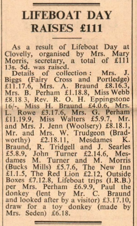Lifeboat Day at Clovelly, organised by Mrs Mary Morris, raises £111 13s 5d.