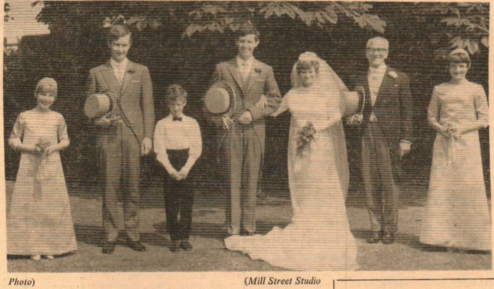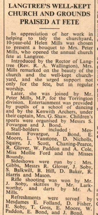 Peals on the bells greeted the wedding at All Hallows Church, Woolsery, of Mr John Frederick Gough, elder son of Mr and Mrs F J Gough, of 25 Belair Road, Peverell, Plymouth, and Miss Lorna Griffiths, only daughter of Mr and Mrs C B Griffiths, of The School House, Woolsery. The Vicar, Rev S Roy Northmore, officiated at the service at which Mr G H Paddon was Server and T Harding and C Raffe were acolytes. Mrs H S Thomas was at the organ. By request the wedding march was played by the bride’s uncle, Mr R V Griffiths. The church had been specially decorated for the occasion by Mesdames S R Northmore, Raffe, Peard and Perkins. Two friends were bridesmaids – Misses Gillian Raffe and Rosemary Peard, Nicholas Short was pageboy, and the best man was the bridegroom’s brother, Robert. As the bride came out of the church she was presented with a silver horseshoe by little Allison Peard. Following a reception at Durrant House Hotel, Northam, Mr and Mrs J F Gough left for a honeymoon touring Cornwall. Bride’s and bridesmaids’ dresses and the outfit of the bride’s mother were made by Mrs Mugford, of Sticklepath, Barnstaple.
